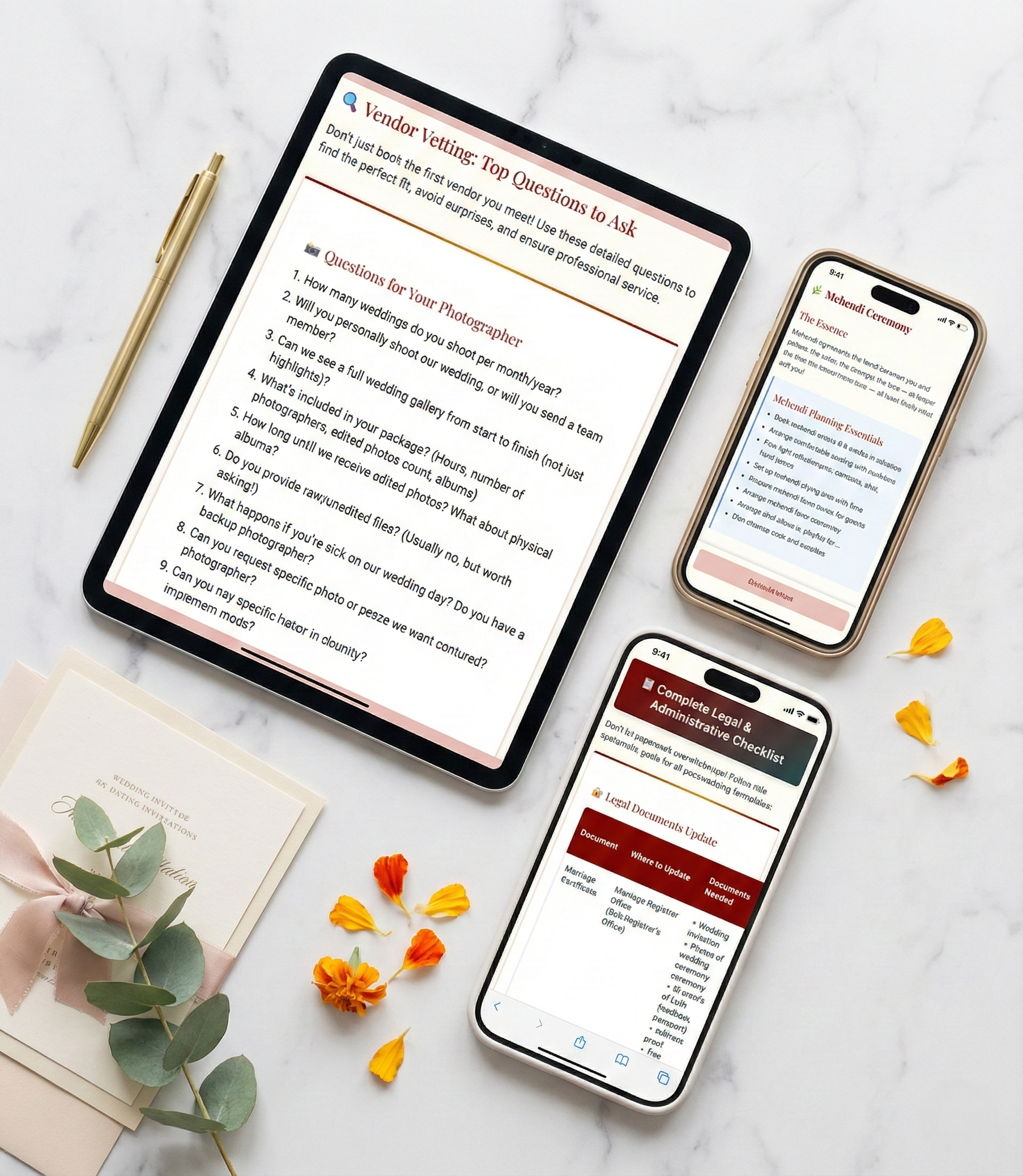 - Vendor & Budget Mastery: Expert templates for vetting photographers, caterers, and makeup artists, plus a smart budget calculator to allocate funds wisely.