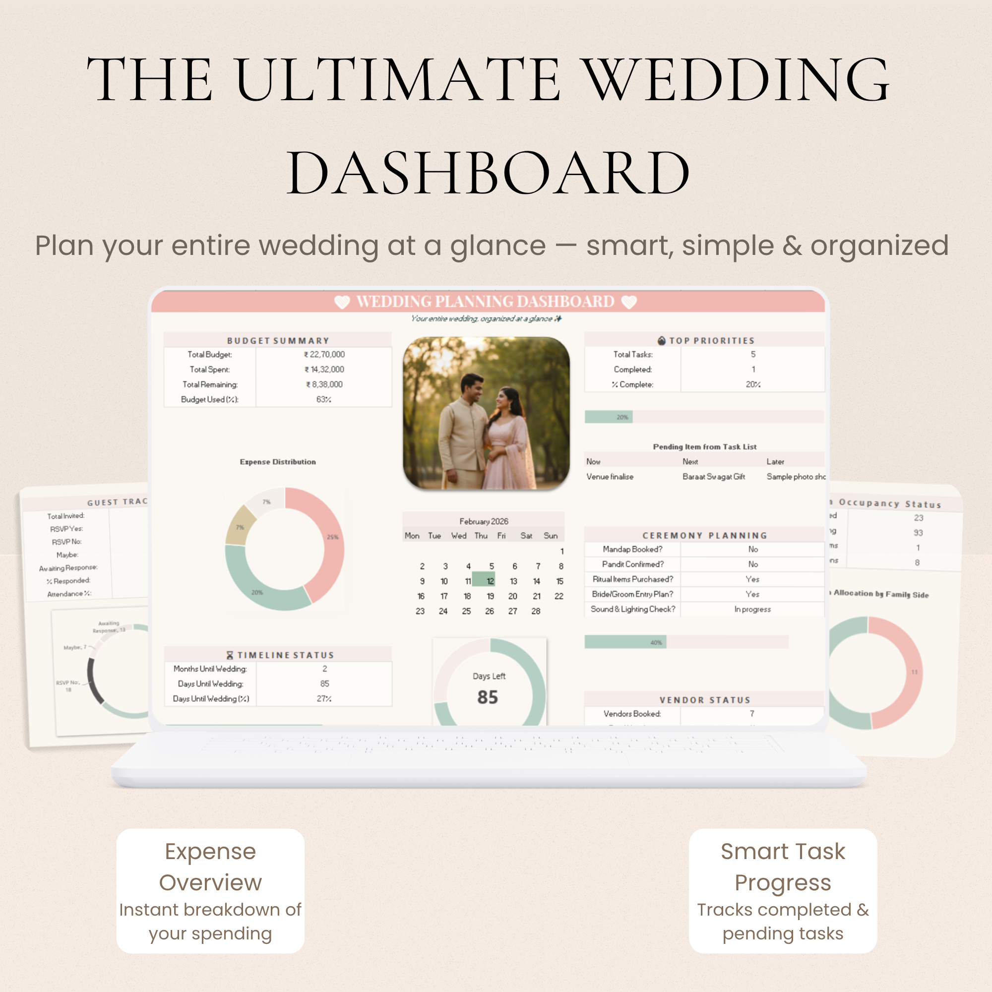 Your entire wedding at a glance — budget, tasks & guests auto-update together